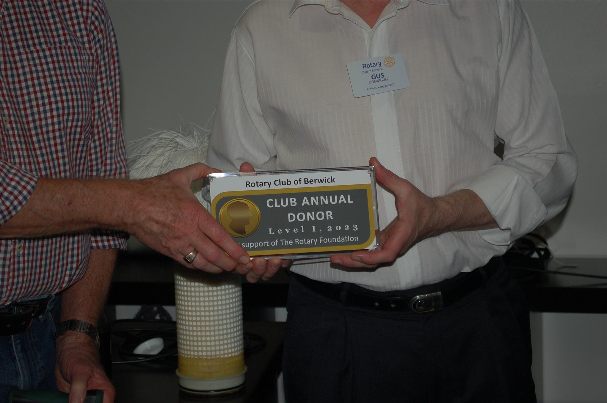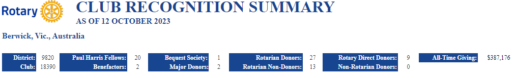 Our Rotary Club of Berwick also has a Centurion Club, which used to have widespread support from our members when PP Rob Taylor (Dec.) used to run it. Rob encouraged each member to contribute $100 AUD annually. Looking back. It was a personal reminder and a gesture of respect that transformed this tax-deductible donation into a painless and gratifying experience, especially when our collective Club generosity was recognized.