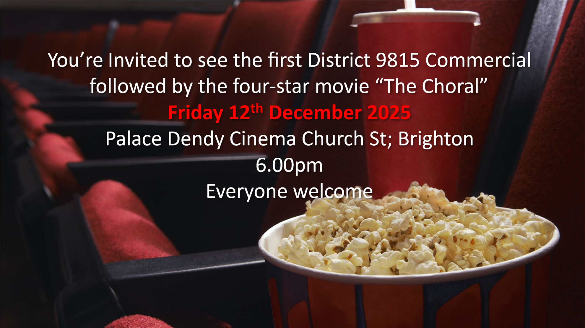Everyone is invited to the screening of the District 9815 Rotary commercial, which will be shown at cinemas throughout the district. The first screening of the commercial will be played on Friday 12 December at Brighton before the movie The Choral. This will be a big Rotary event for the district. See the invite below for details.