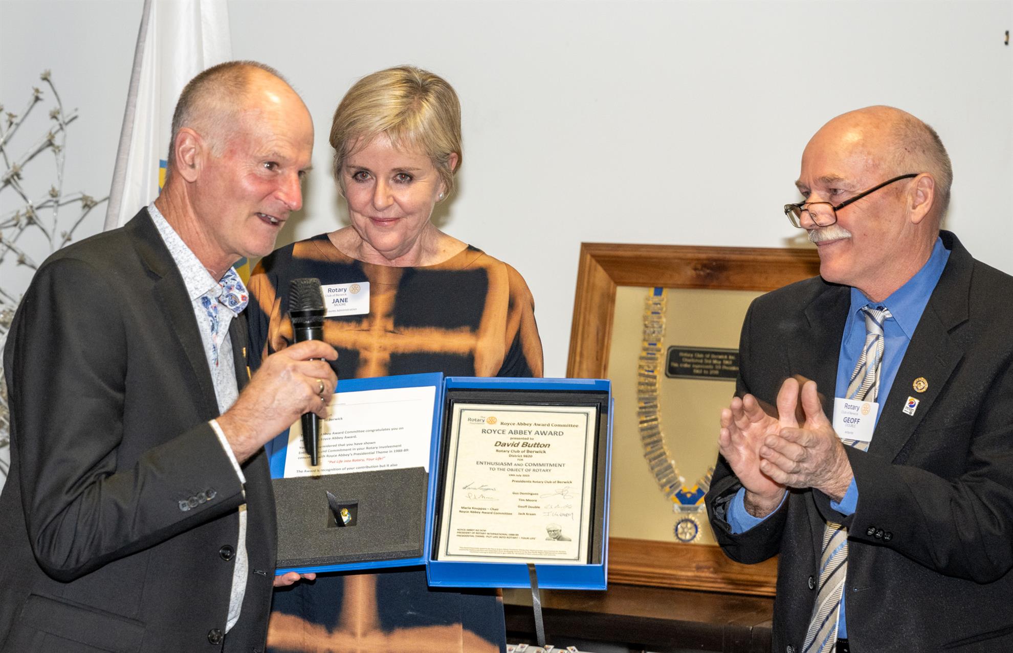 Judy, Amber, David and Saffron Button One of the highlights of the evening was the presentation of a Royce Abbey award to a much-deserved member of the Rotary Club of Berwick! In the late 80’s Royce Abbey, a member of the Rotary Club of Essendon, became the third Australian Rotarian to serve as President of Rotary International. In recognition of Royce Abbey’s leadership, District Governors from around the world established The Royce and Jean Abbey Endowed Fund within The Rotary Foundation. The fund has financed nearly thirty Royce and Jean Abbey Vocational Scholarships, giving farmers, teachers and community leaders from the Asia Pacific Region and beyond, the opportunity to gain practical skills in Australia. Each scholarship provides $10,000USD for up to three months and covers travel, accommodation and community development in areas consistent with Rotary’s Seven Areas of Focus. The Royce Abbey Award is granted by a Rotary Club to one of its members to recognise their Enthusiasm and Commitment to Rotary, consistent with Royce Abbey’s Presidential theme of ‘Put Life into Rotary, Your Life’. The contribution of $1000 by a Club, which accompanies each award, means that the Royce and Jean Abbey Vocational Scholarship can continue to grow and make a difference to communities in developing countries. It was a great honour to present this award is a member of our Club. The list of his activities and achievements is too long to mention, and we would have been there all night to list them all, but they include active Rotary membership for almost 19 years, ongoing support to The Rotary Foundation, International projects and support of Donations in Kind, National projects, such as organising matching grants for Blaze-Aid trailers, District projects and sponsorship support and last, but not least, two years in a row as President of our great Club during a very challenging time. Congratulations to a very worthy recipient, Past President David Button, on receiving the Royce Abbey Award. It was great to see that David’s wife, Judy and both his daughters, Saffron and Amber, were there to share this moment with David.