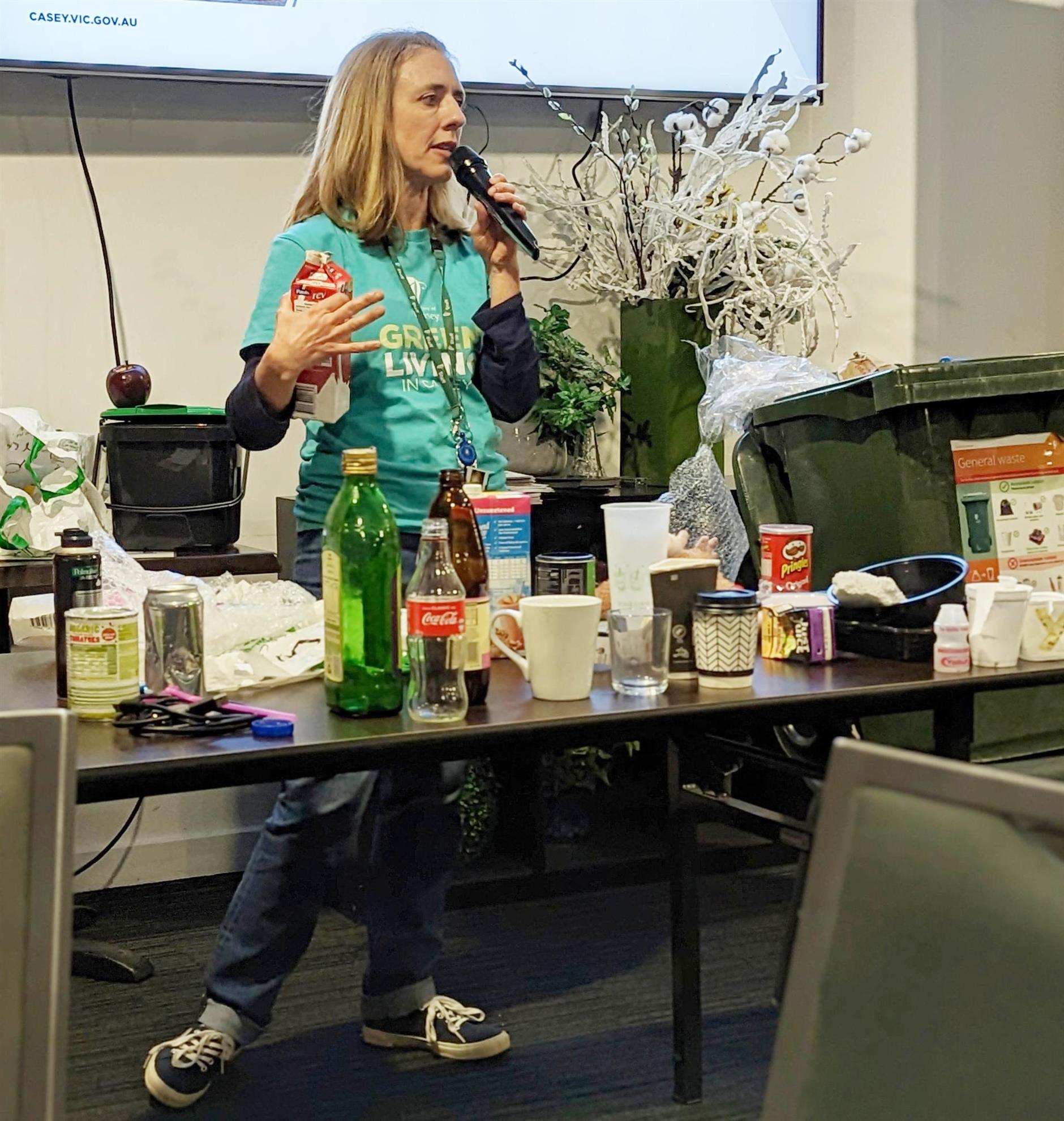 Starting with a table full of domestic waste items, Lynelle explained why each item should be placed in the appropriate bin; the green bin for landfill rubbish and the blue for recyclables.