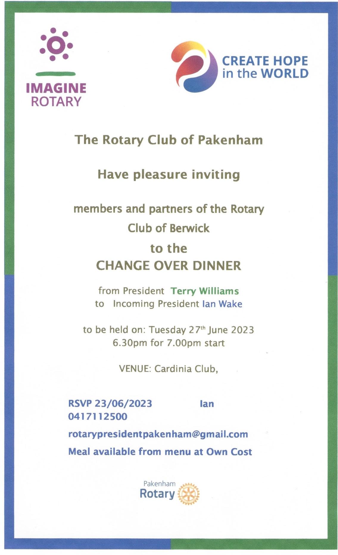 Incoming President Dave Anderson together with our 2023 four shared presidents, Past Presidents Gus Dominguez, Tim Moore, Geoff Double and Jack Kraan, invite you to celebrate the 62nd changeover of the Rotary Club of Berwick