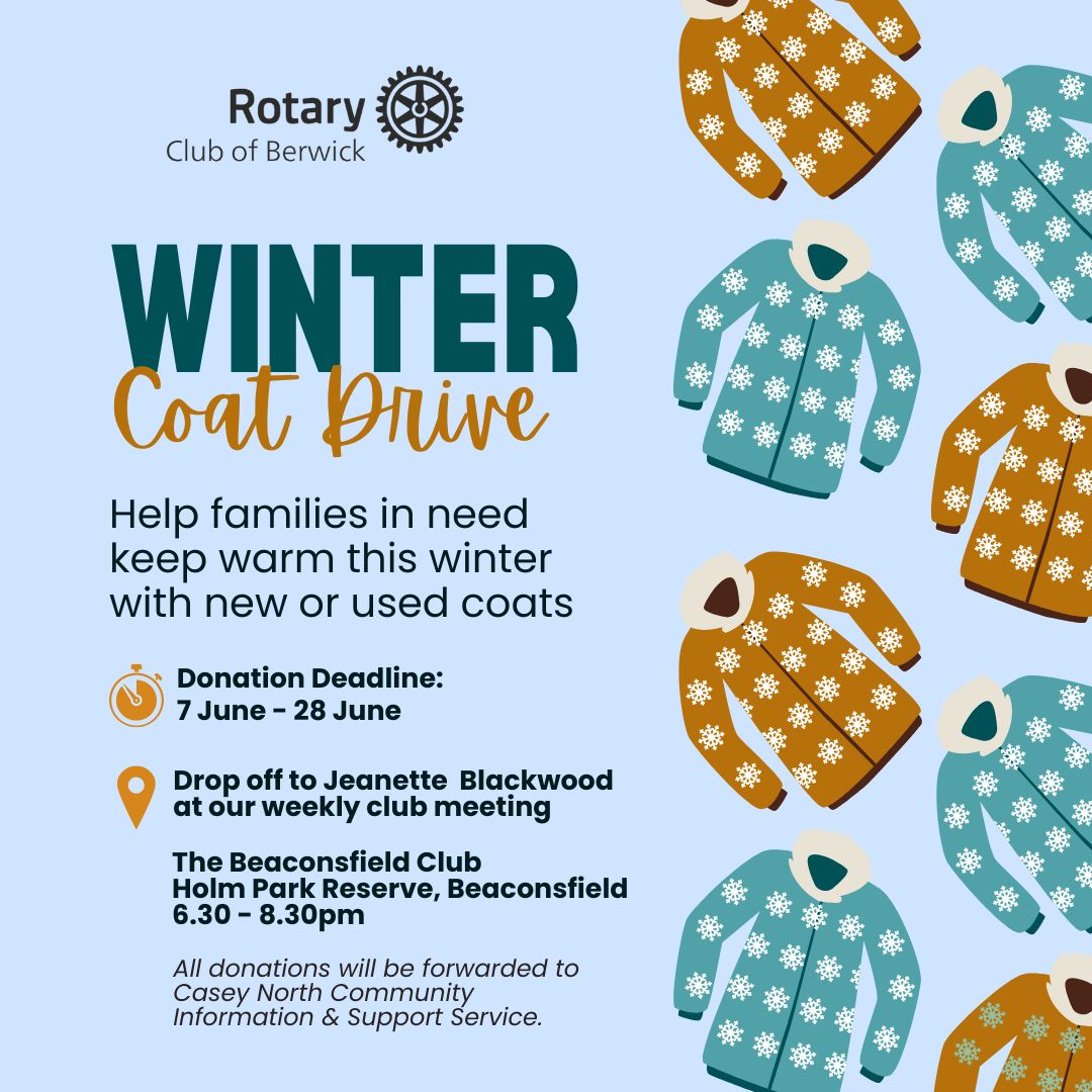 Jeanette has kindly offered to receive donations from you, family, or friends, at our June club meetings. Let's help those in need keep warm this winter.