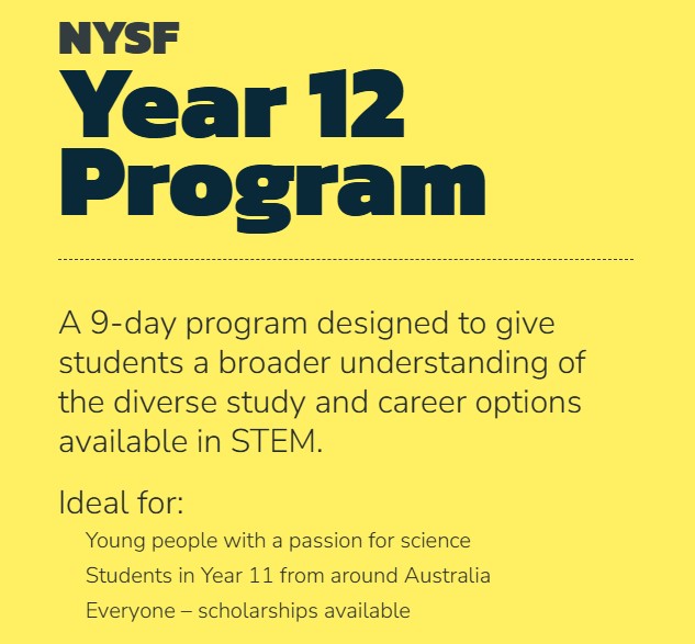 The National Youth Science Forum Year 12 Program is a 9 day program designed to give students about to start year 12 a broader understanding of the diverse study and career options available in science, technology, engineering and mathematics (STEM)